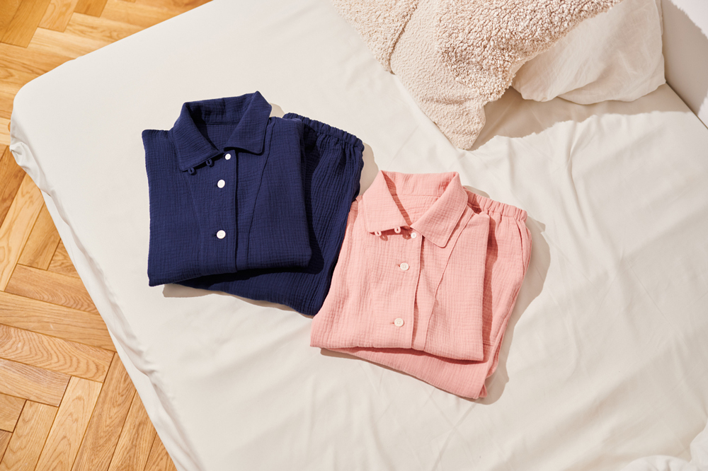 また柔らかな天然コットン100%のガーゼ生地は、通気性・吸湿性に優れ、肌あたりにも配慮。縫い目を減らした仕様と便利なアウトポケットにより、くつろぎやすい着用感を実現しています。さらに襟や裾は保温性を高める設計で、外気の侵入や体温の放出を防ぎ、冷え対策にも効果的です。